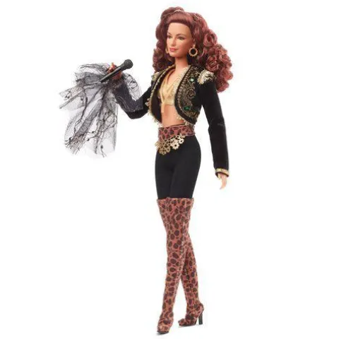 Inspired by the iconic music video, Barbie doll’s black jacket features intricate gold detailing with jeweled accents and a dramatic, oversized lace sleeve. A soft leopard belt is accentuated with a gold waist chain, while bold thigh-high boots and gold accessories complete her look. A microphone accessory and doll stand make this posable doll ideal for display.