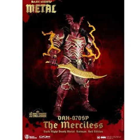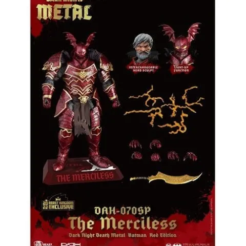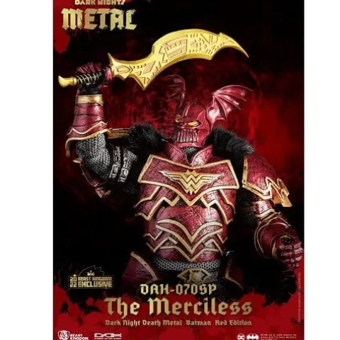 From Beast Kingdom. A PREVIEWS Exclusive! From DCs Multiverse Earth 12 storyline, Batman, who now wears the helmet of the Greek God Of War, Ares, has transformed into a maniacal, world conquering villain! Beast Kingdom presents the new Dynamic 8ction Heroes DAH Batman The Merciless Special Red Edition figure! This 1/9 scale action figure of one of the most ruthless rendition of Batman to ever grace comic books features 18 points of articulation and armor that combines medieval metallic accents and chainmail with Batman’s signature style. In addition to the set of replaceable hands and the helmet, the set includes three unique head sculpts all showing a battered and angry Bruce Wayne, who is ready for war. The special edition San Diego Comic Con exclusive set is limited to only 600 pieces in the US and comes with its own limited warranty card!