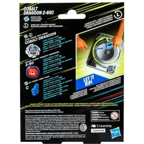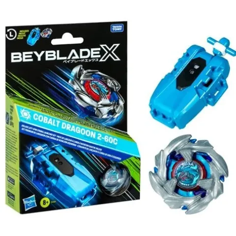 Experience the thrill of the next generation of Beyblade tops, Beyblade X. The Cobalt Dragoon 2-60C Left-Spin String Launcher Set will help you in your quest for Beymastery. The Deluxe Left-Spin String Launcher and Cobalt Dragoon 2-60C Attack Type left-spin top work with the X-Celerator Gear System to level up your game and prove it in battle! When the gear of the top engages the X-Celerator Rail of a Beyblade X Beystadium (sold separately), it can super-accelerate into an Xtreme Dash, rocketing it around the arena for crushing collisions and epic bursts. Pull the string of your launcher to unleash the Cobalt Dragoon 2-60C in a frenzy of fury. Bladers launch their top against their opponent’s top, scoring points with each confrontation – first to 4 points wins. Mix and match the interchangeable blade, ratchet, and bit with those of other Beyblade X tops (sold separately) to create your own unsurpassable Bey. Hasbro Beyblade toys with authentic Takara Tomy die-cast metal tops make great kids gifts for boys and girls ages 8 and up.