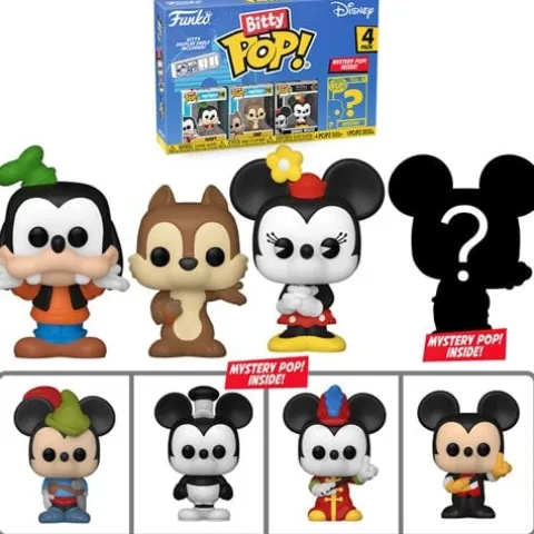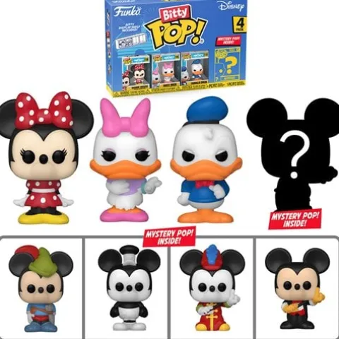 Running out of space for full-sized Pop! Vinyl Figures? Build a collection of your favorite Pop! Vinyl Figures that take of a fraction of the space! Each Bitty Pop! Mini-Figure measures approximately 1-inch tall and comes packaged in a miniature acrylic Pop! box. The bottom lid of the pop box can be opened to remove the Bitty Pop!, but the figure is attached to the bottom lid. Each Bitty Pop! 4-Pack includes 4x Bitty Pop!s in individual acrylic Pop! boxes, with the set of 4 lined up horizontally together in a long acrylic case. 3 characters are visible, while one is a mystery and could be any one of 4x possible chase figures with varying rarities!
