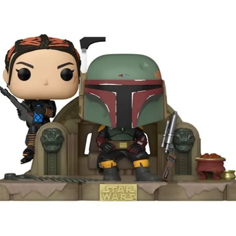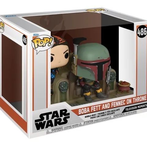 This Star Wars: The Mandalorian Boba Fett and Fennec Shand Pop! Moment features the duo sitting on Jabba’s throne. Comes packaged in a window display box.