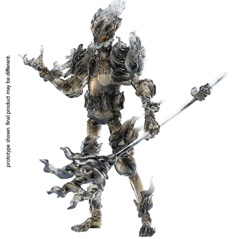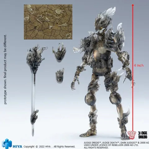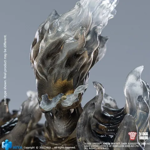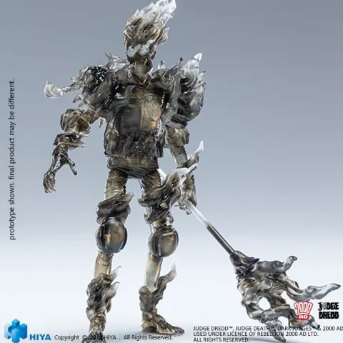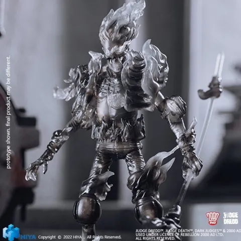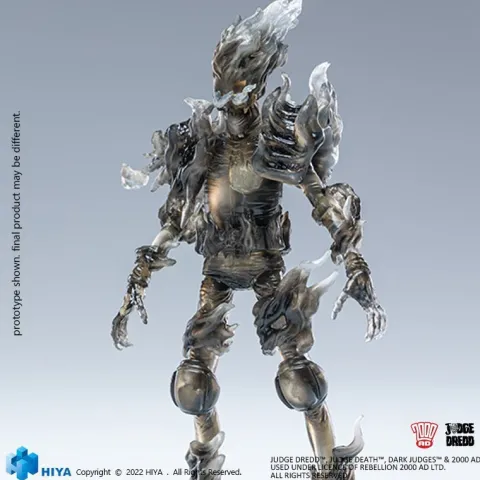 From Hiya Toys. A PREVIEWS Exclusive! The latest white hot variant action figure is the black and white Judge Fire! Hiya Toys and Rebellion are proud to announce another of the 1/18-scale PVC action figures in the eagerly anticipated range based on the world of Judge Dredd. Final member of the Dark Judges, Judge Fire is Clothed in eerie, lethal flames and carries his lethal trident, Fire brings death and destruction everywhere he goes! This PREVIEWS Exclusive black and white variant of the Judge Fire figure will come with 16 points of articulation, shoulder and joint pads, chain and badge of office, utility belt, and his mighty flaming trident.