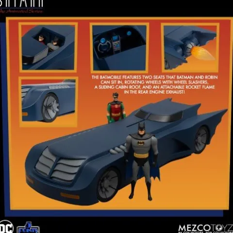 From Mezco Toys. Batmobile: the supercharged, gadget-filled vehicle empowering Batman and Robin as they embark on their daring missions to keep Gotham safe. The 5 Points Batman: The Batmobile features two seats that Batman and Robin can sit in, rotating wheels with wheel slashers, a sliding cabin roof, and an attachable rocket flame in the rear engine exhaust and you are ready to roll out! The Batmobile is packaged in a window box, perfect for display. The 5 Points Batman: The Animated Series Batmobile is packaged in a collector-friendly box, designed with collectors in mind.