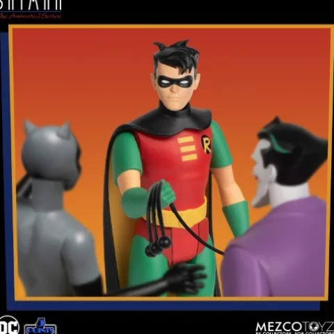 From Mezco Toys. Inspired by the 90s animated series, 5 Points Batman: The Animated Series contains everyone’s favorite crime-fighting duo and a variety of Gotham City’s most notorious villains, each complete with their own interchangeable heads, arms, and accessories. Each figure is individually packaged in a retro style blister card, perfect for display! Collect Batman: the legendary crime-fighting hero of Gotham, equipped with cutting-edge tech and honed to peak human ability to combat evil; Robin: the Boy Wonder, trained by Batman himself, ventures into the night with his caped mentor as Gotham’s greatest crime fighters, known as the Dynamic Duo; The Joker: the eccentric Clown Prince of Crime and one of Batman’s deadliest arch-enemies, weaving his sinister jokes and pranks into heinous crimes in his attempts to take over Gotham City; and Catwoman: A purr-fectly skilled criminal, thief, and the ultimate nemesis of Batman & Robin.