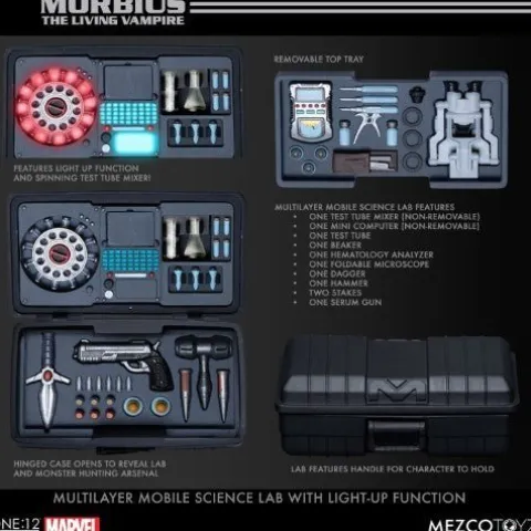 From Mezco Toys. The One:12 Collective welcomes Morbius, the living vampire! Morbius wears a fitted bodysuit with a winged cape and features three head portraits, capturing varying degrees of his grisly nature. The Nobel Prize-winning biochemist comes complete with a multilayer mobile science lab with a light-up function. The removable top layer holds science equipment such as a foldable microscope, handheld hematology analyzer, and removable test tube and beaker, while the bottom layer conceals weapons such as a dagger, customized handgun, and hammer. Comes packaged in a collector friendly box, designed with collectors in mind.