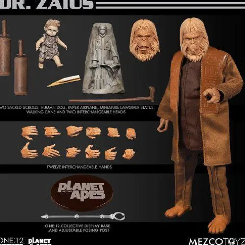 Resident of Ape City, Dr. Zaius served a dual role in ape society as the Minister of Science, in charge of advancing ape knowledge and also as Chief Defender of the Faith, believing that religion and theories of science worked interchangeably. Leading member of the Ape National Assembly, the One:12 Collective Dr. Zaius is outfitted in a tunic shirt and overcoat with embossed detailing, and pleated pants. Included is a miniature polystone Lawgiver statue, the central orangutan prophet deity. The Chief Defender of Faith comes with a range of accessories as seen in the film such as a human doll, walking cane, two Sacred Scrolls, and a paper airplane. Each One:12 Collective Dr. Zaius figure is packaged in a collector friendly box, designed with collectors in mind.