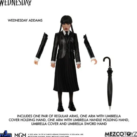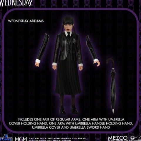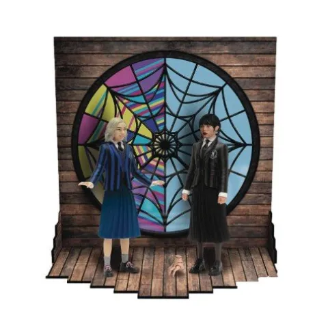 From Mezco Toys. From the hit streaming series, Wednesday, Wednesday Addams and Enid Sinclair are conjoured in retro-fabulous 5 Points style! This boxed set includes Wednesday and Enid in their Nevermore Academy uniforms, Wednesday’s trusty hand-servant Thing, and a dorm-room playset! Once assembled, the Ophelia Hall dorm-room features the split dorm and a massive stained-glass window in the background. The two roommates with opposite personalities navigate through the mysteries at Nevermore Academy together, forming an unlikely yet unbreakable bond. 5 Points are Mezco’s upgrade to the articulated action figures of yesteryear. These highly detailed, posable action figures feature some of pop culture’s most familiar faces, both old and new. The 5 Points Wednesday & Enid Boxed Set is packaged in a collector-friendly box, designed with collectors in mind.