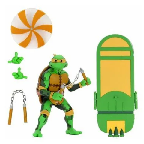 Oh Goodie. Fresh turtles for lunch! From the classic 1990s Turtles in Time video game, here comes this Series 2 Michelangelo 7-inch scale action figure. Michelangelo comes with his signature weapons and a hoverboard with display stand that can be used for even more poses. Michelangelo features special deco that recreates the pixilated look of the video game and come in individual window boxes with graphics from the original arcade cabinet.