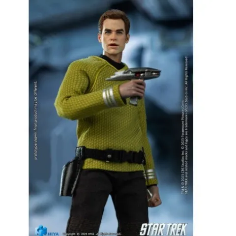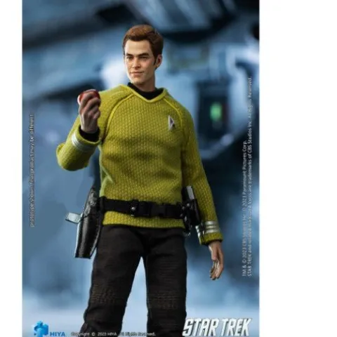 From Hiya Toys. A PREVIEWS Exclusive! Hiya Toys is proud to announce the newest installment in the 1/12 scale EXQUISITE SUPER Series: James T. Kirk from Star Trek 2009! This brand-new James T. Kirk action figure stands at 6.2″ tall and faithfully reproduces his appearance from the film. He is dressed in the iconic yellow uniform with Starfleet emblem representing command and strategic personnel. His clothes, jeans and belts are all made from real cloth, ensuring both superior poseability and aesthetic appeal. His communicator, phaser pistol, voice logger, Whiskey Flask, and other accessories are all finely detailed, and along with interchangeable parts, fans can recreate various dynamic action poses! A special stand for this series is also included, featuring a black base adorned with the Star Trek logo, fully immersing you in the ambiance of the Star Trek universe.