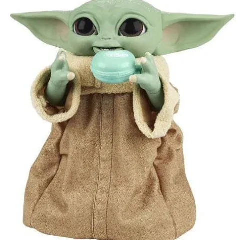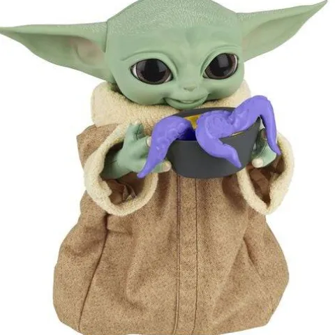 If you’re wondering how to feed the Child, this is the way. The Galactic Snackin’ Grogu animated toy comes with 4 interactive accessories (bowl with tentacles, cookie, shifter knob, and spoon) that, when placed in his hand, he will react to with animations and sound effects. Pretend to feed Grogu (The Child) with the series-inspired accessories and he will react to them with eating, yummy, or yucky sound effects! Kids and fans can pat the Galactic Snackin’ Grogu toy’s head 3 times to activate a 2-handed Force animation, in which he will mimic channeling the Force, inspired by snacking scenes from the Disney+ series The Mandalorian.