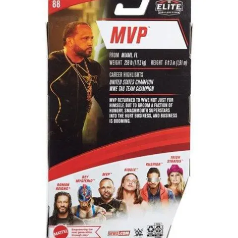 Capture the blowout action of WWE Superstars with this WWE Elite Collection Series 88 MVP Action Figure! Featuring one of WWE’s biggest personalities and champions, this bold and colorful figure is approximately 6-inches and comes ready to wreak havoc right out of the box! Figure has deluxe articulation for multiple ways to pose and play, True FX enhanced facial detailing for life-like authenticity, WWE ring gear and iconic accessories—all with amazing detail capturing the Superstar’s unique personality. Get all the WWE Elite Collection figures and let the collecting and battles begin!